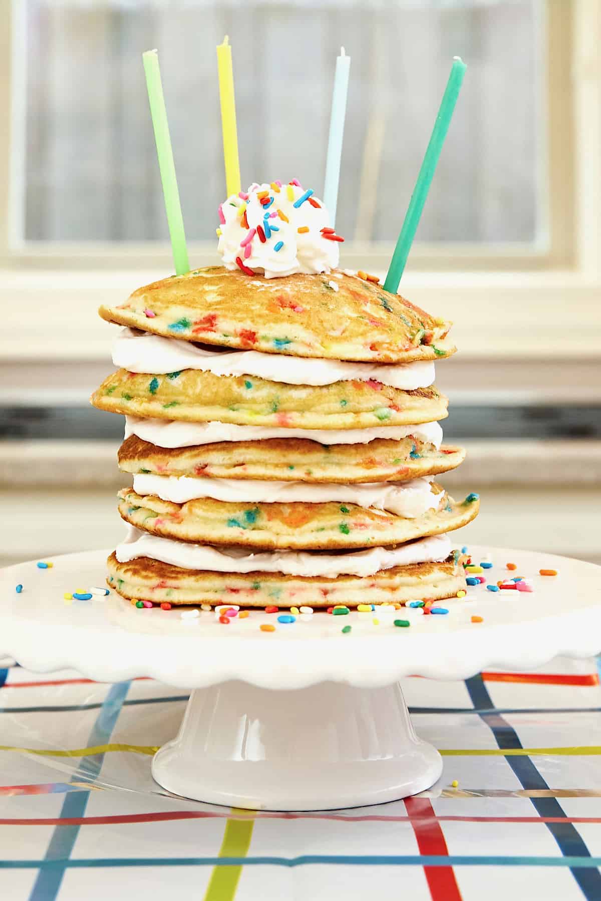 Celebrate birthdays and important milestones with a Confetti Cake Pancake for breakfast! Sweet whipped topping between layers of homemade Confetti Pancakes and topped with even more whipped cream and sprinkles.