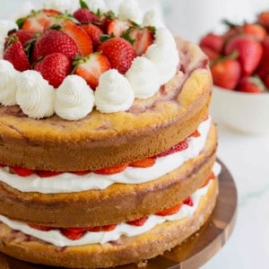 This Strawberries and Cream Swirl Cake is a stunning layered cake that’s moist and loaded with fresh strawberries and sweet whipped cream frosting!